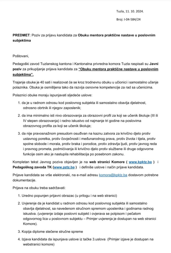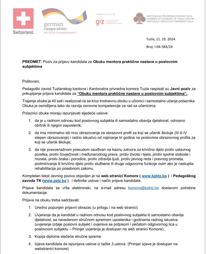 Pedagoški zavod Tuzlanskog kantona i Kantonalna privredna komora Tuzla raspisuju Javni poziv za prikupljanje prijava kandidata za “Obuku mentora praktične nastave u poslovnim subjektima”.