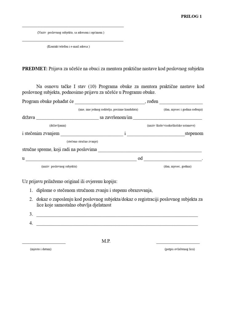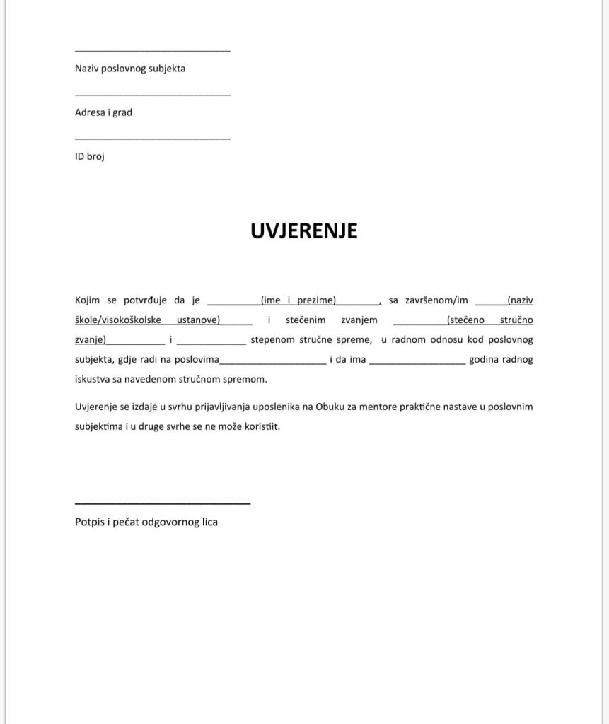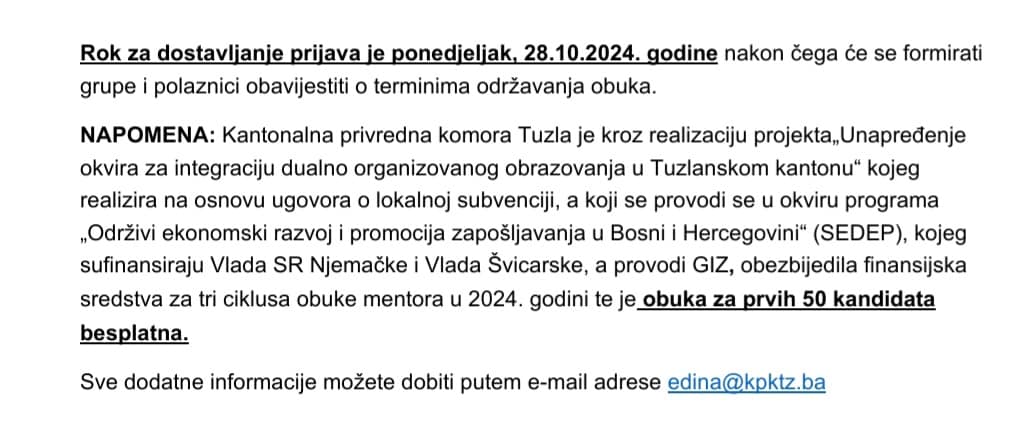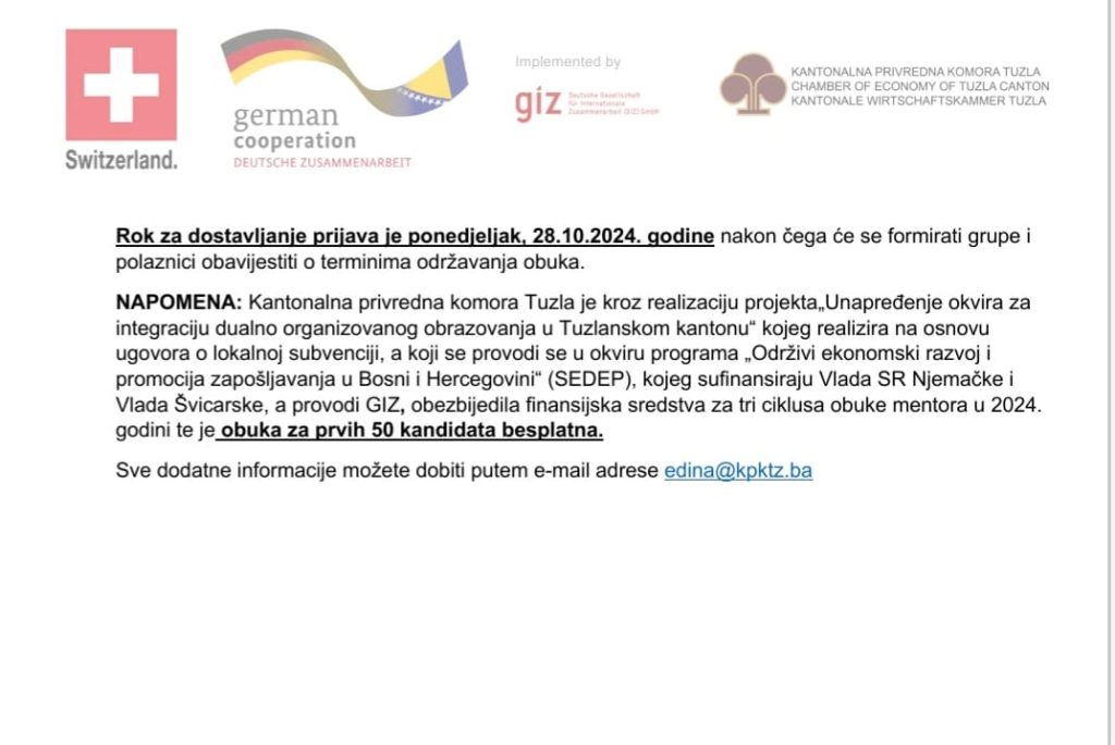 NAPOMENA: Kantonalna privredna komora Tuzla je kroz realizaciju projekta „Unapređenje okvira za integraciju dualno organizovanog obrazovanja u Tuzlanskom kantonu“ kojeg realizira na osnovu ugovora o lokalnoj subvenciji, a koji se provodi se u okviru programa „Održivi ekonomski razvoj i promocija zapošljavanja u Bosni i Hercegovini“ (SEDEP), kojeg sufinansiraju Vlada SR Njemačke i Vlada Švicarske, a provodi GIZ, obezbijedila finansijska sredstva za tri ciklusa obuke mentora u 2024. godini te je obuka za prvih 50 kandidata besplatna.