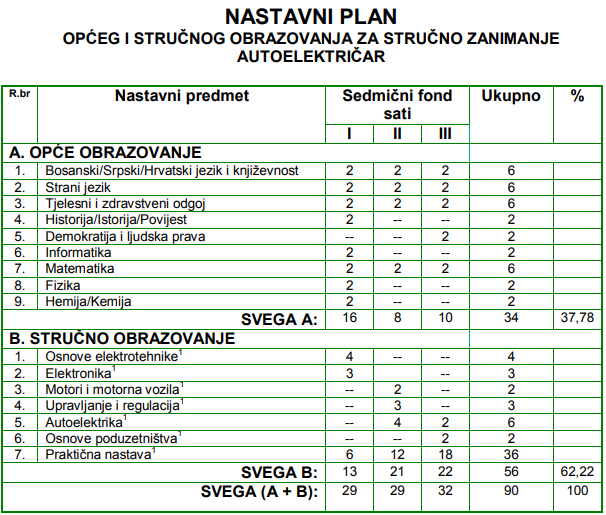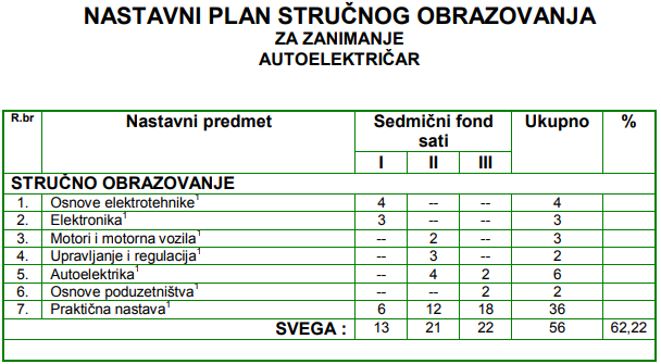 - posjeduje osnovna znanja za montažu, ispitivanje i kontrolu, puštanje u rad, rukovanje i održavanje električnih uređaja i instalacija na motornim drumskim vozilima;